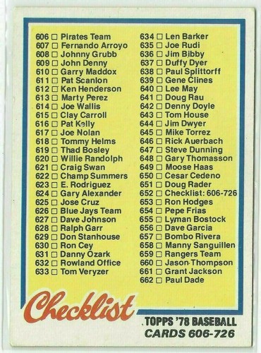 1978 Topps Baseball 652 Checklist 606 726 Clean And Unmarked Ebay